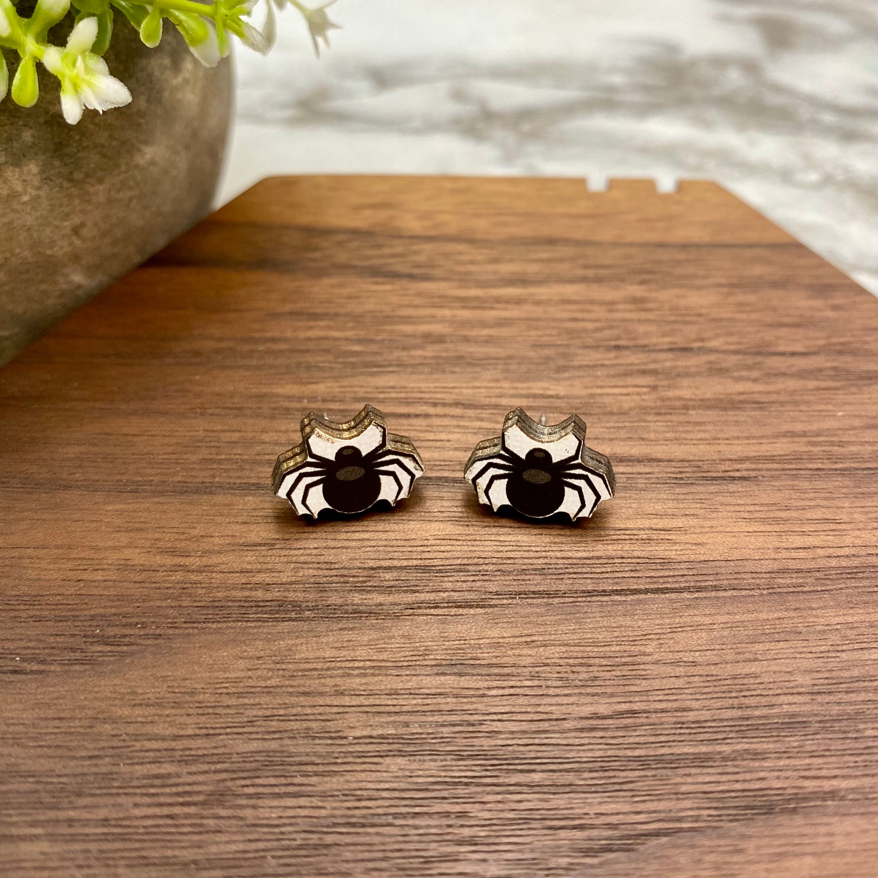 Wooden Stud Earrings - Halloween - Black Spiders